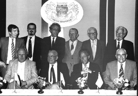 Foto: 50 jarig bestaan FSC op 20 november 1985. Bestuur met ereleden: van L. naar R. zitten: D. Noordhoff, E. de Ham, J. de Vries en P. Lourens erelid, staand: A. Antonisse, J. Charisius, G. de Vries Jr., R. v.d. Werff, Chr. Bijlstra en J. Visser.